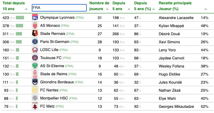 La France est le deuxième pays européens auquel la formation a rapporté le plus, lors des 10 dernières années. L'OL est en tête devant Monaco, Rennes et le PSG. L'OM ne figure pas dans le TOP 100.
